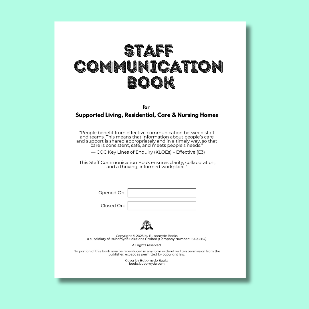 In care settings, poor communication isn’t just an inconvenience—it’s a risk to safety, quality, and compliance. This Staff Communication Book is your ultimate solution for ensuring crystal-clear, consistent, and documented staff communications in Supported Living, Residential, Care, and Nursing Homes.
