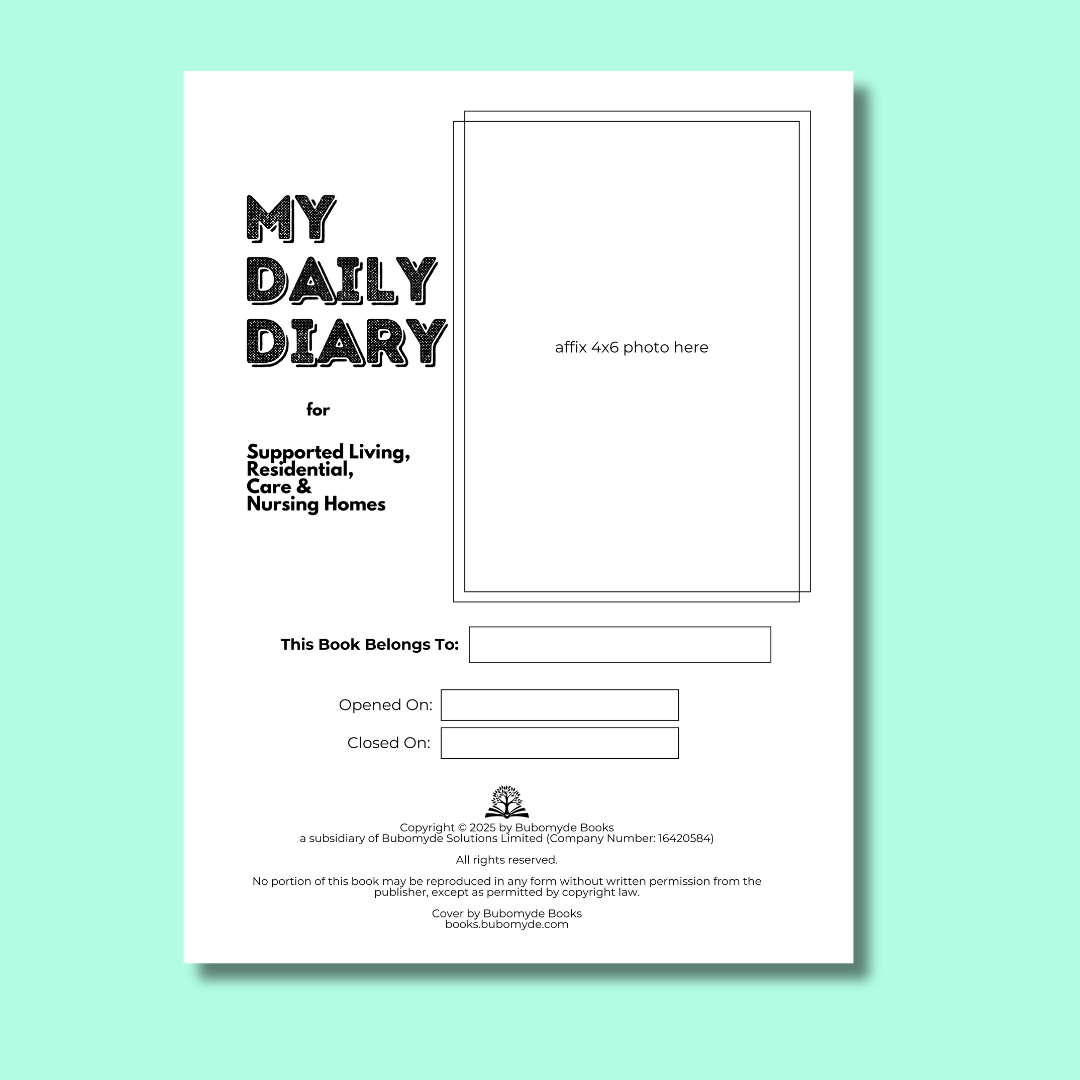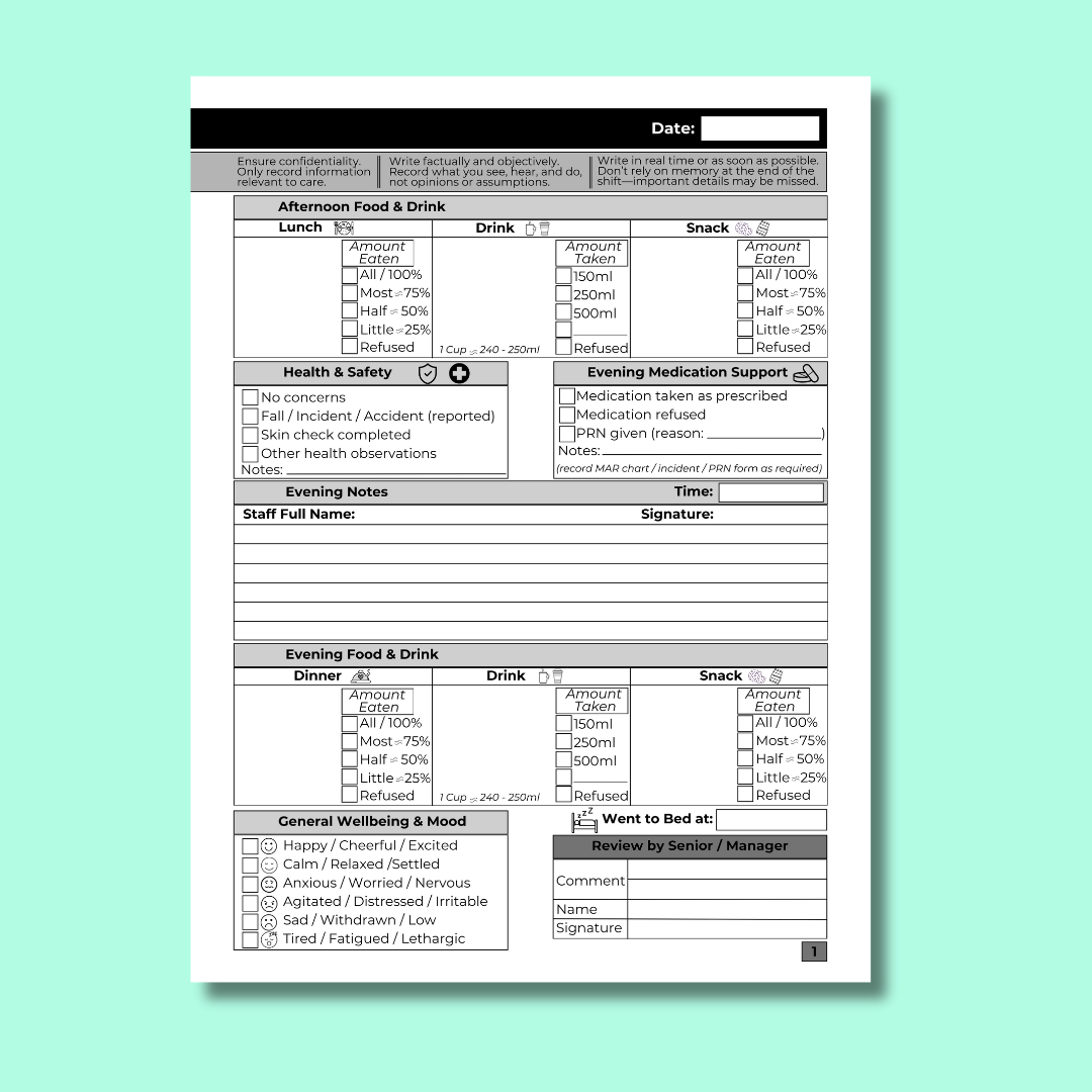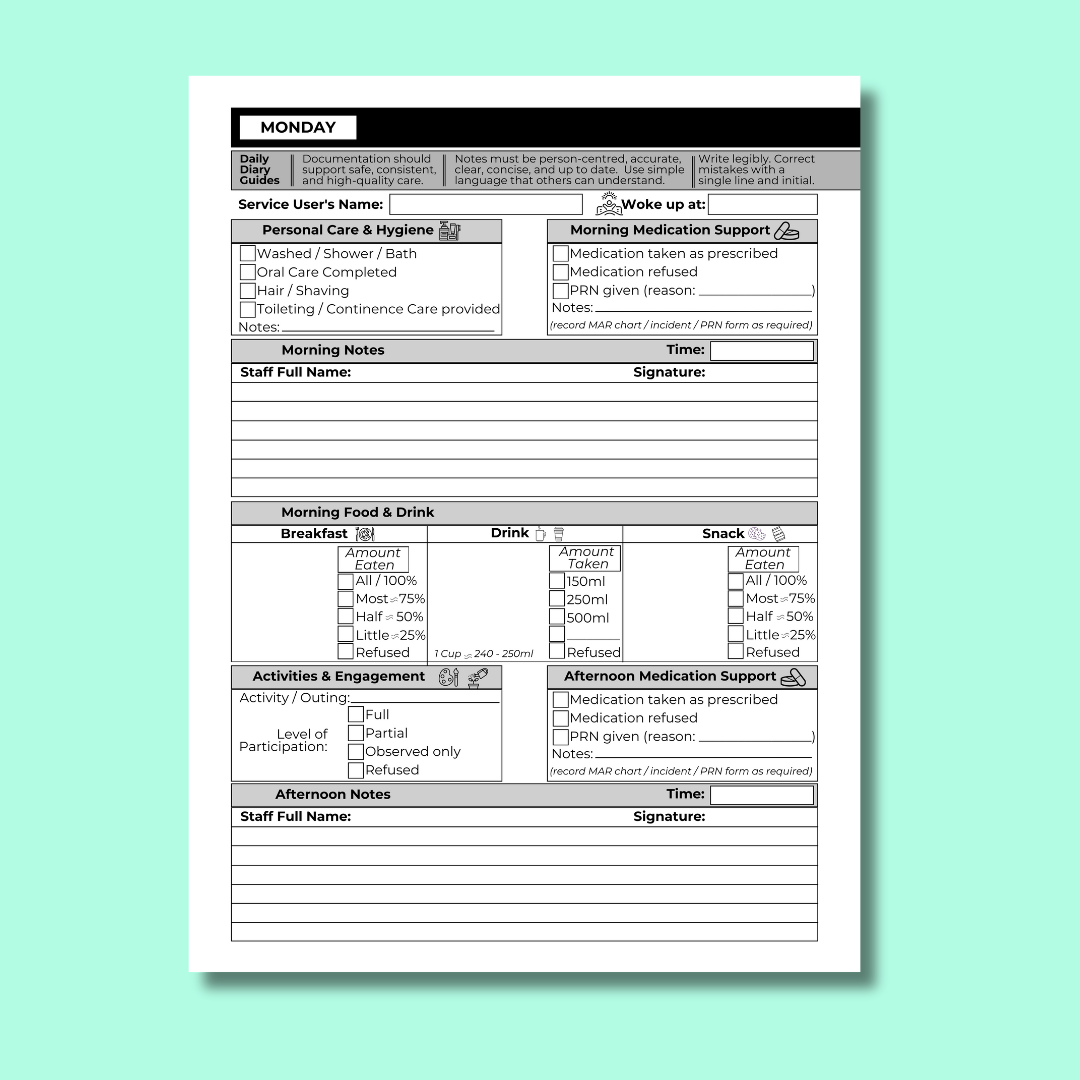 With its structured, easy-to-follow format, this diary supports seamless communication between shifts, enhances person-centred care, and ensures you are always inspection-ready for bodies such as the Care Quality Commission (CQC), Care Inspectorate Wales (CIW), Care Inspectorate, Regulation and Quality Improvement Authority (RQIA), Centres for Medicare & Medicaid Services (CMS), Ministry of Long-Term Care, and others.